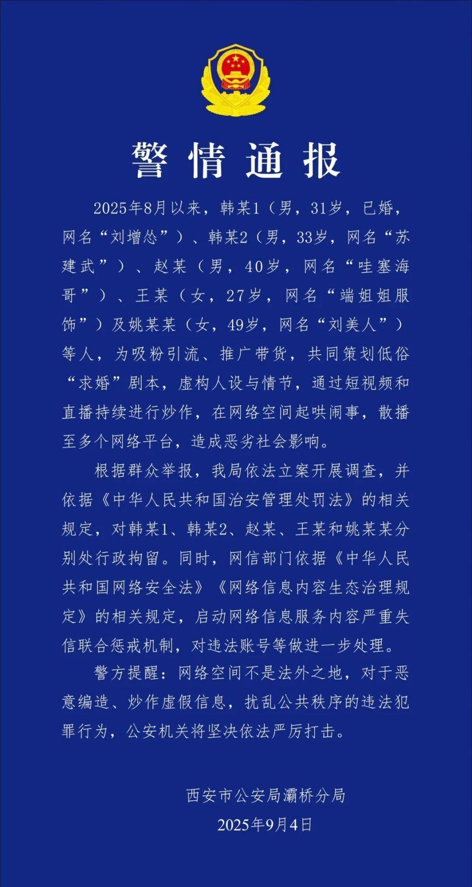 中国网9月5日讯 因共同策划低俗“求婚”剧本并持续炒作,5人被行拘!9月4日,西安市公安局灞桥分局发布通报: